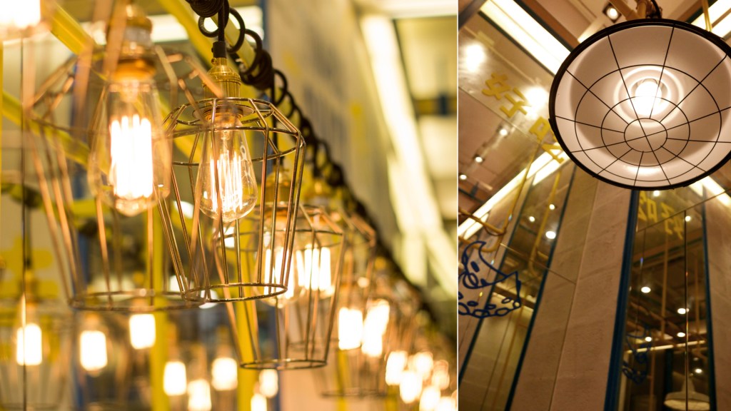 Modern cage-style pendant lights contribute industrial elegance to the restaurant design, adding a contemporary flair that appeals to a wide demographic. Reflective surfaces amplify the lighting, making the space feel bright, open, and inviting. These touches enhance the visual depth of the interior while maintaining a clean and stylish appearance that aligns with the brand’s vibrant character.