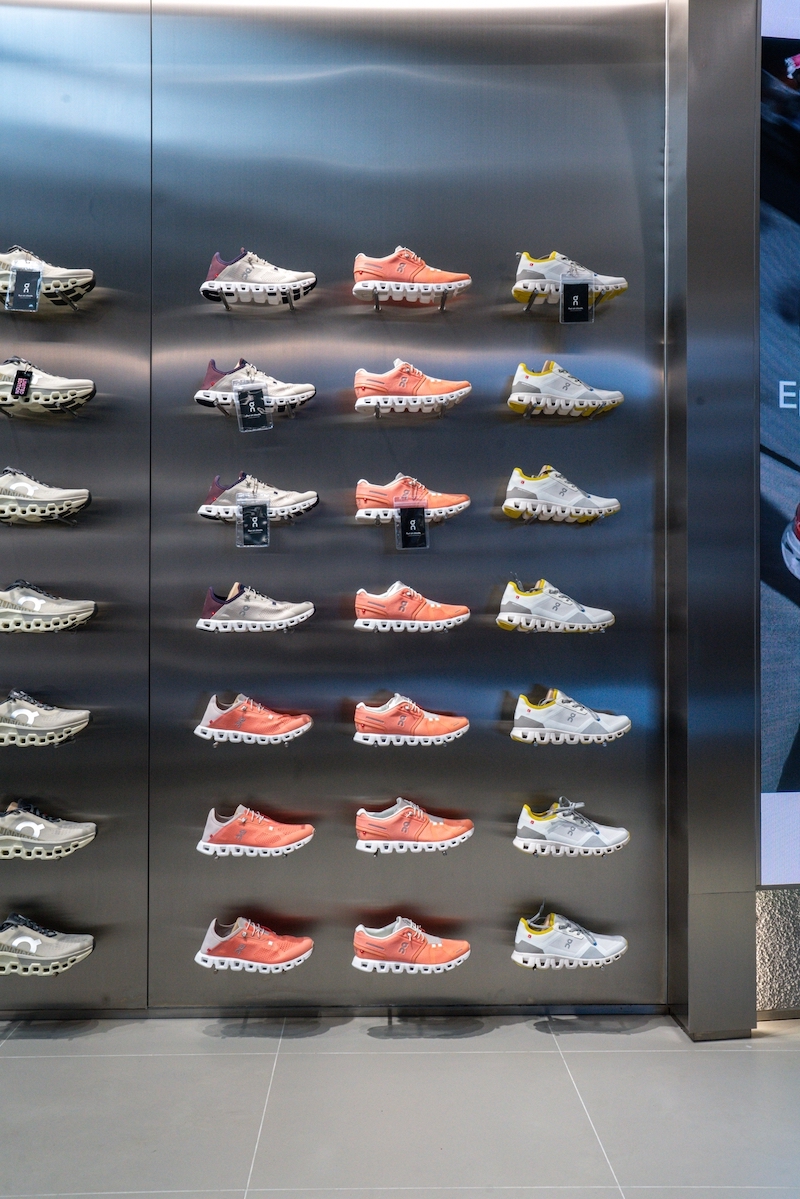 The layout is thoughtfully crafted to maximise functionality and aesthetic appeal. Rows of shoes are displayed on floating shelves embedded in stainless steel walls. This shop design concept ensures optimal visibility, placing the products at the forefront while maintaining a clean, uncluttered look.