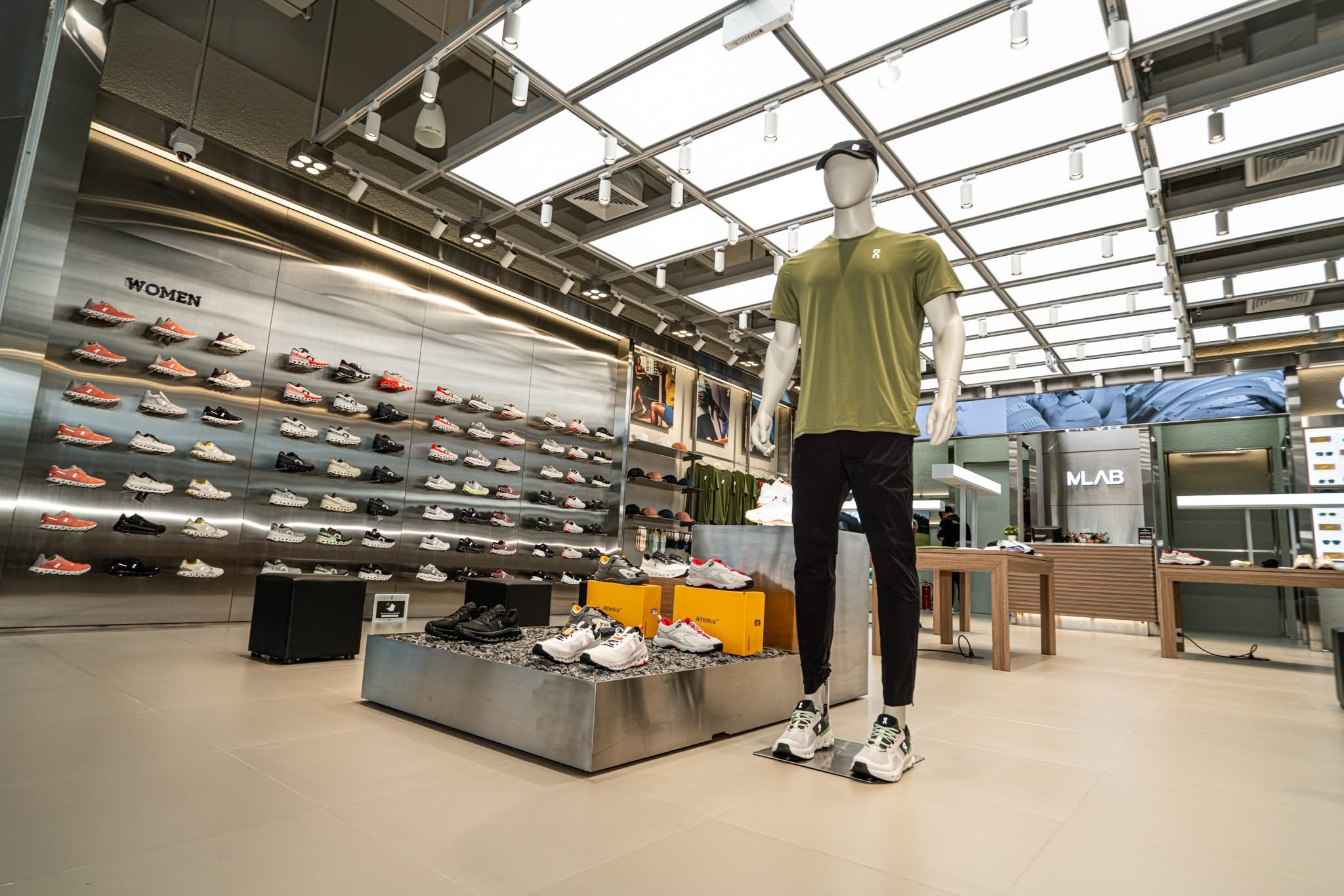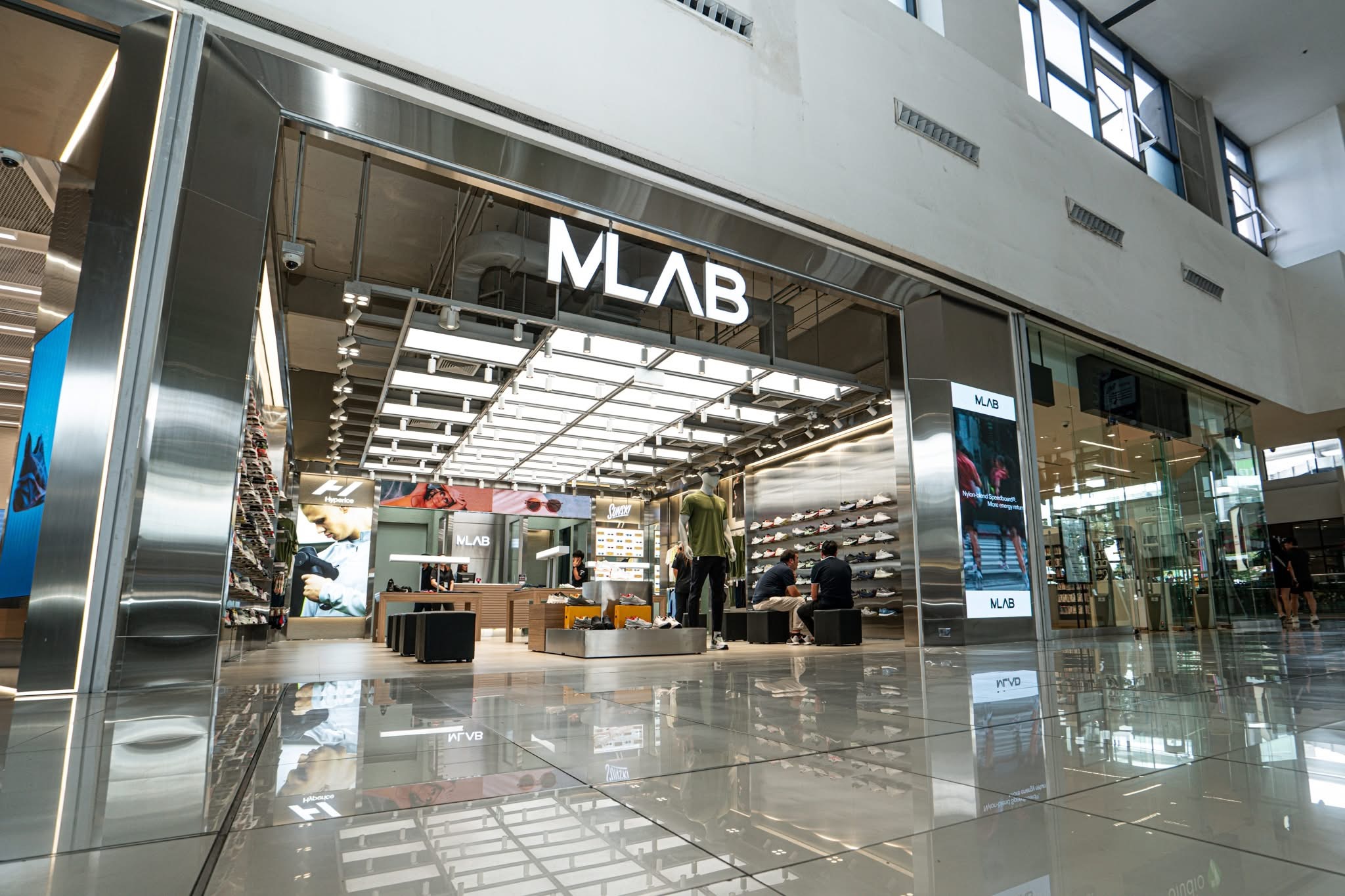 MLAB Mega Bangna seamlessly merges athletic style with contemporary elegance, delivering an exceptional interior design that ensures a shopping experience refined and inviting. The store features sleek stainless steel with a hairline finish, presenting a modern appearance while maintaining understated sophistication. This finish gently softens the steel’s reflective surface, allowing light to diffuse subtly and enhancing the polished, upscale atmosphere of the space.