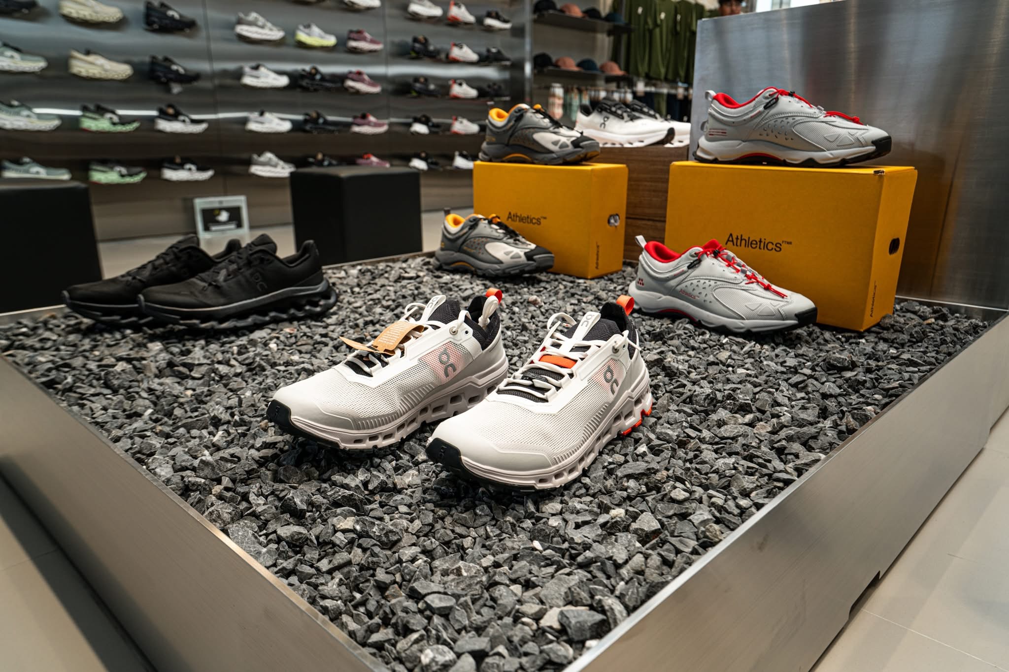 Wall-mounted displays and thoughtfully organised product sections keep the spotlight on the items for sale. This intentional arrangement skilfully showcases both athletic and lifestyle offerings, enhancing the customer journey through the space.