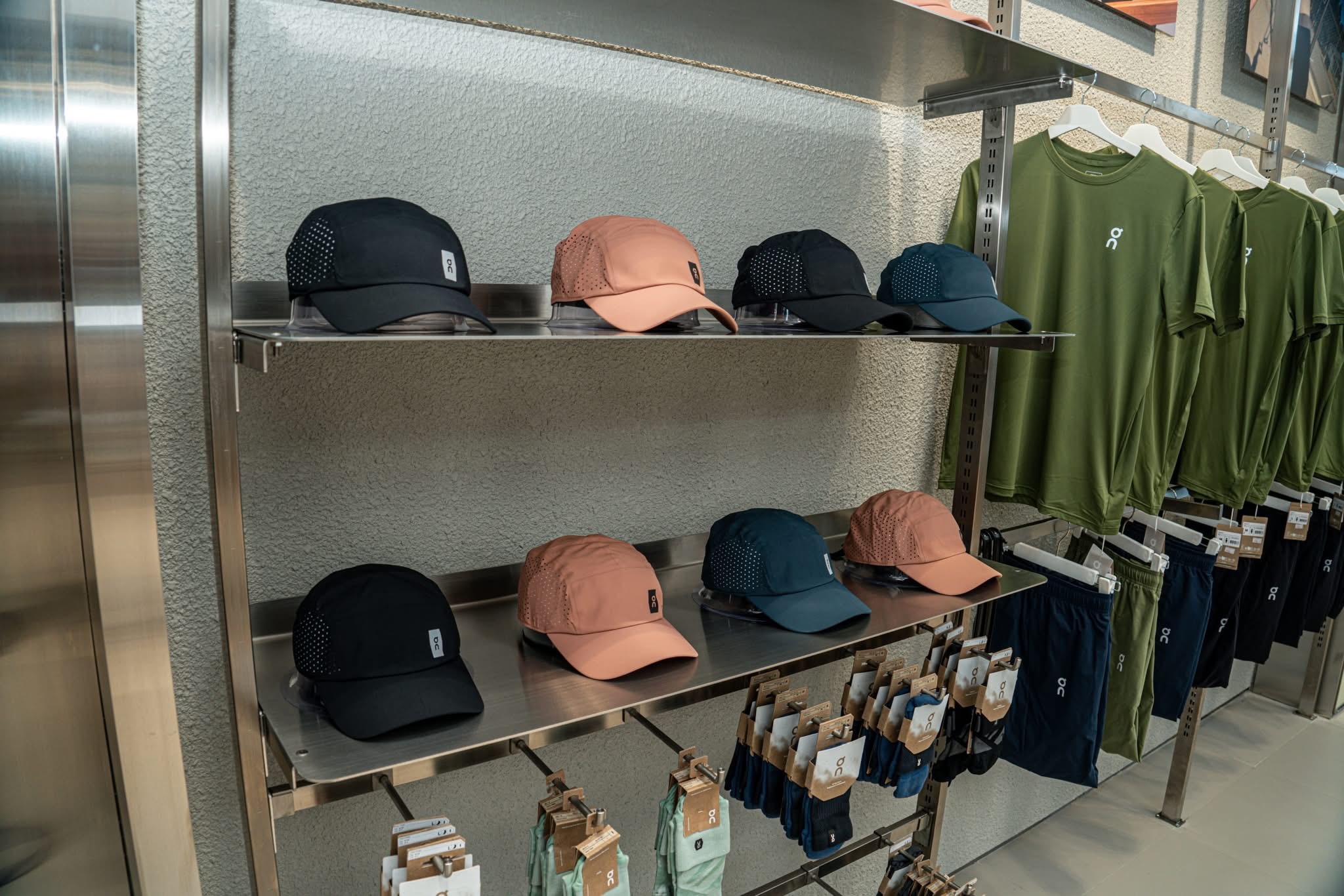 Textured walls and complementary materials create warm contrasts against the industrial steel, adding to the inviting atmosphere of the space. This retail design ensures that the metal surfaces blend seamlessly with the overall ambience, avoiding any sense of coldness. The carefully curated combination of elements fosters a refined yet approachable environment, perfect for showcasing athletic and lifestyle products.