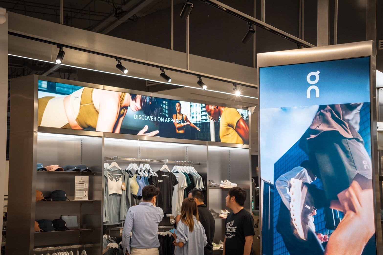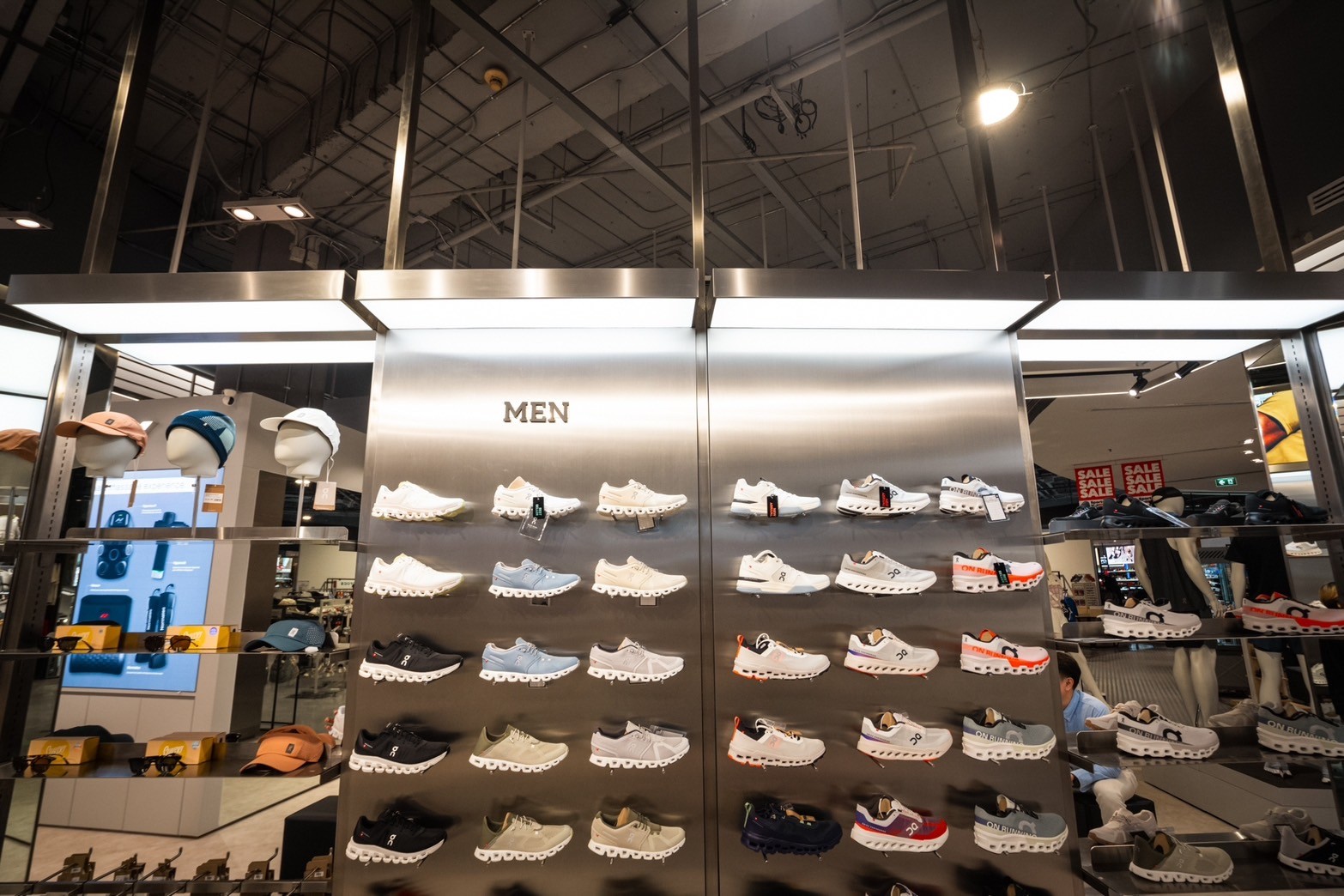 A standout feature of the store’s interior design is its use of linear LED lighting fixtures that contour the ceiling, creating a futuristic frame while ensuring optimal illumination. These lights enhance the clean, structured layout, guiding customers through the space while making the compact area feel open and inviting. Stainless steel elements, central to the retail design, contribute to a sleek, industrial aesthetic, with reflective surfaces amplifying depth and sophistication.