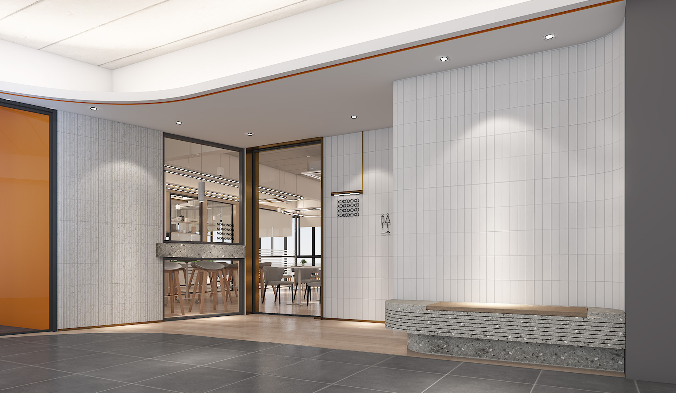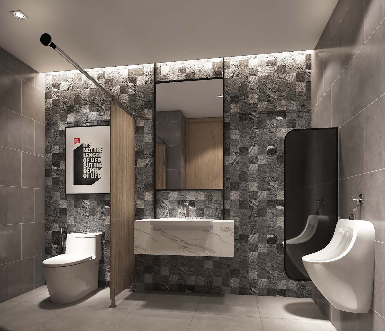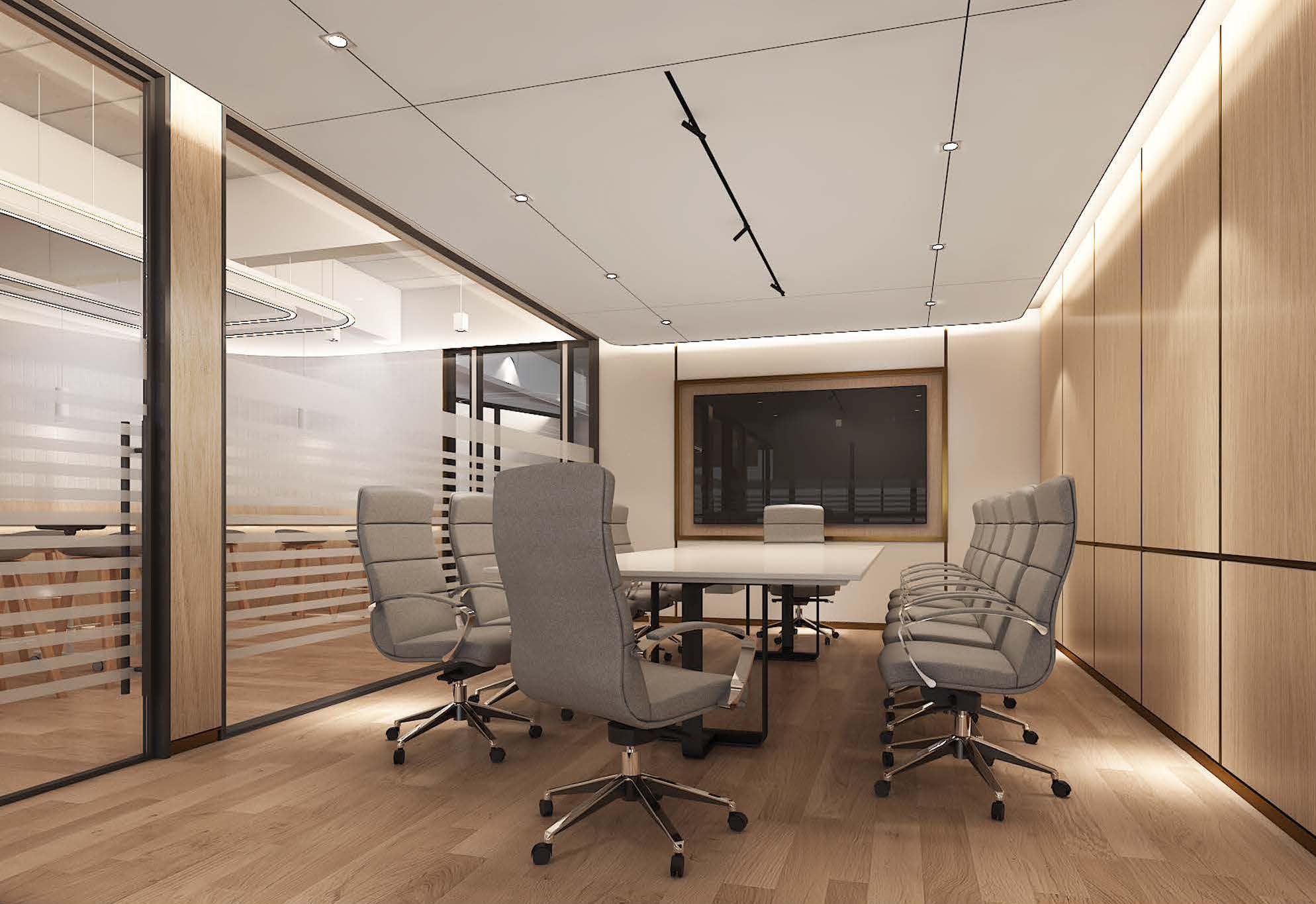Private workspaces and open workstations balance focus and teamwork, featuring ergonomic furniture and warm elements. The executive meeting room exudes professionalism with luxurious finishes, and the restrooms showcase modern aesthetics.