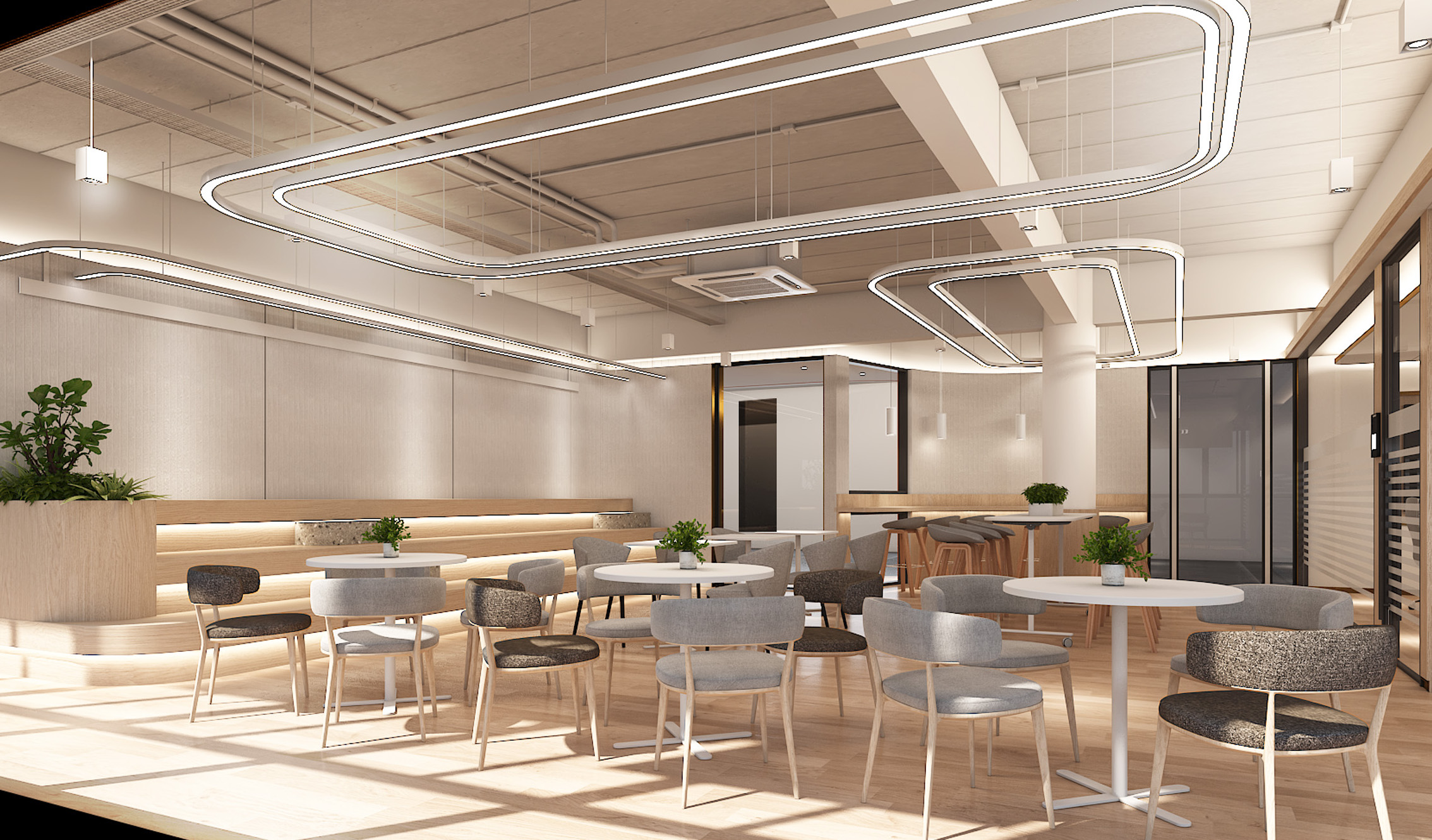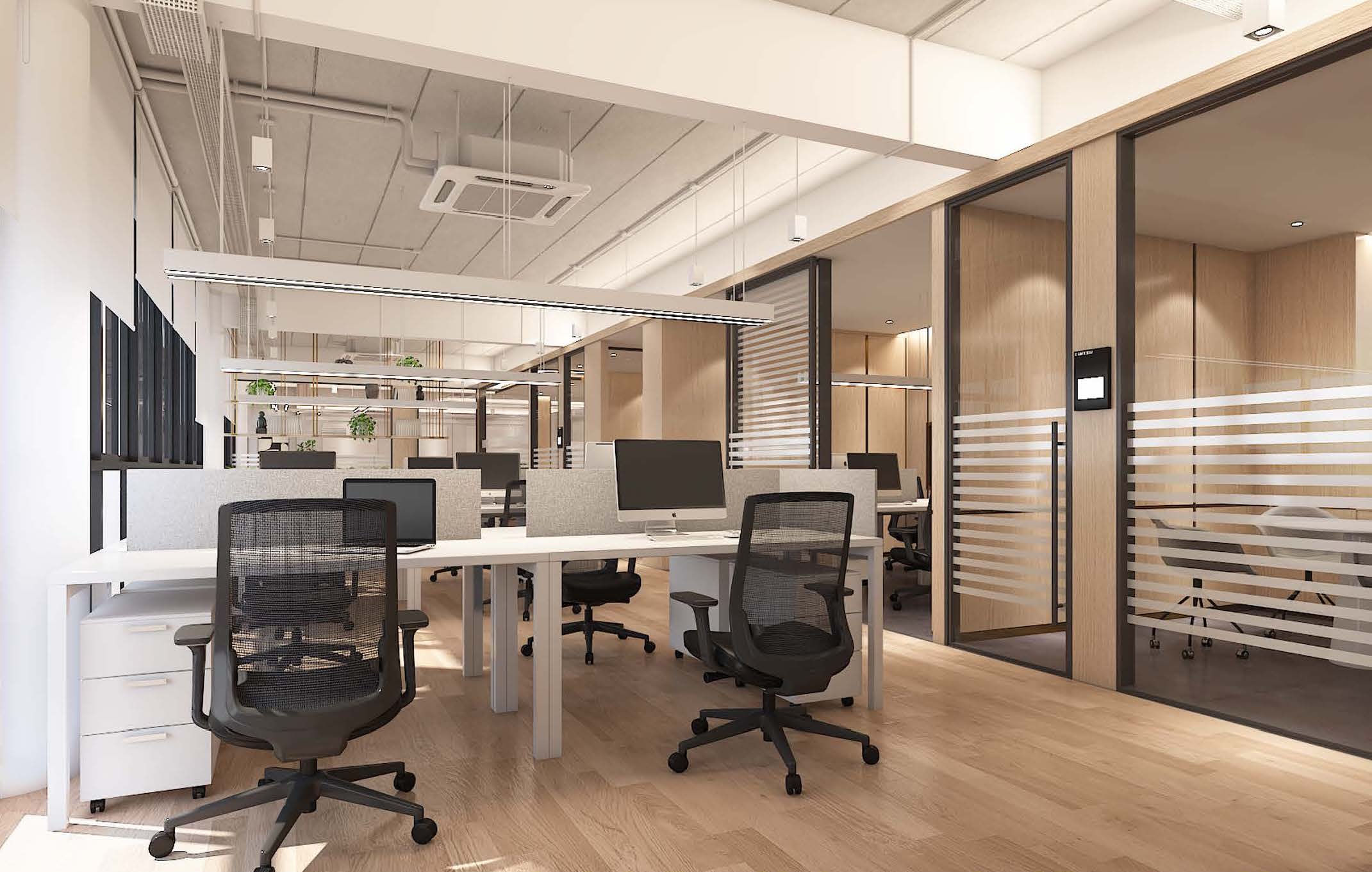 Overall, the design emphasises clean lines, natural materials, and innovative lighting, creating an inspiring environment for productivity and creativity.